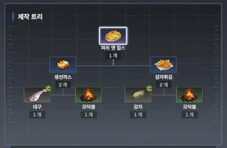 똑같이 모닥불에 구우면 생선까스와 감자튀김이 나오는데 두 개를 조합하면 영웅음식 피쉬 앤 칩스가 나옵니다.
